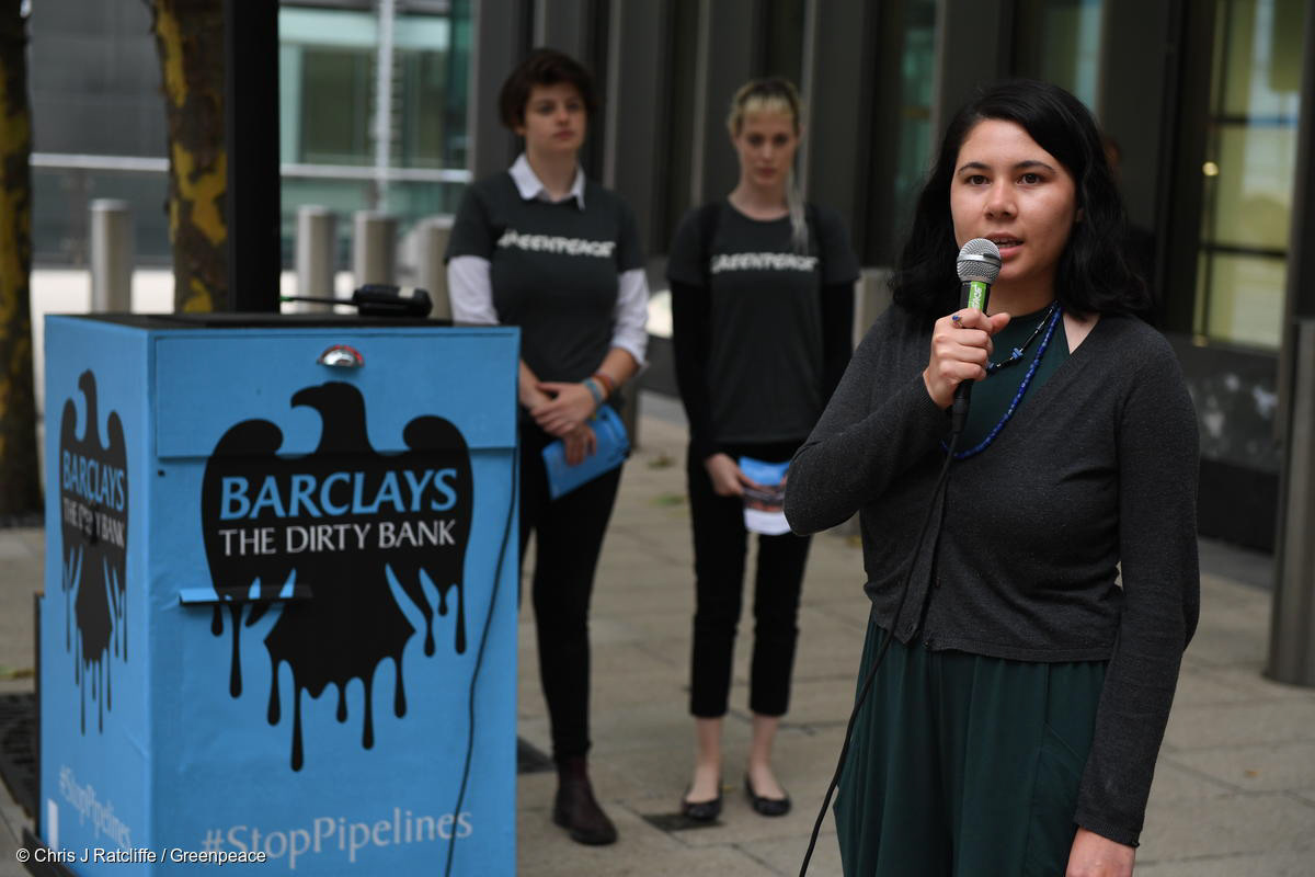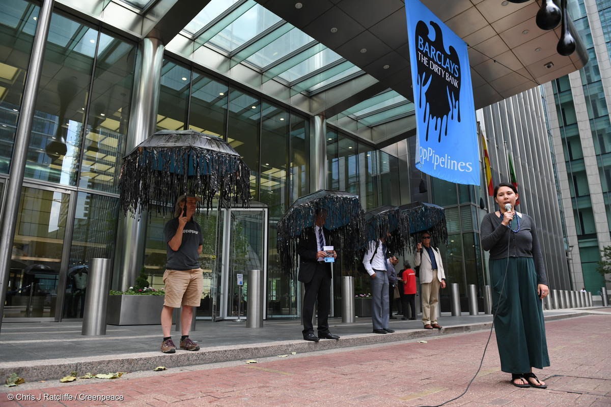 A key part of this action was collaborating with Ocean Hyland from the Tsleil-Waututh Nation, one of the Indigenous communities resisting and being directly impacted by the tar sands pipelines Barclays is still choosing to fund. Ocean came to London to witness the action and we organised a sound system for her to deliver her message to Barclays. We were really appreciative and humbled by her participation.