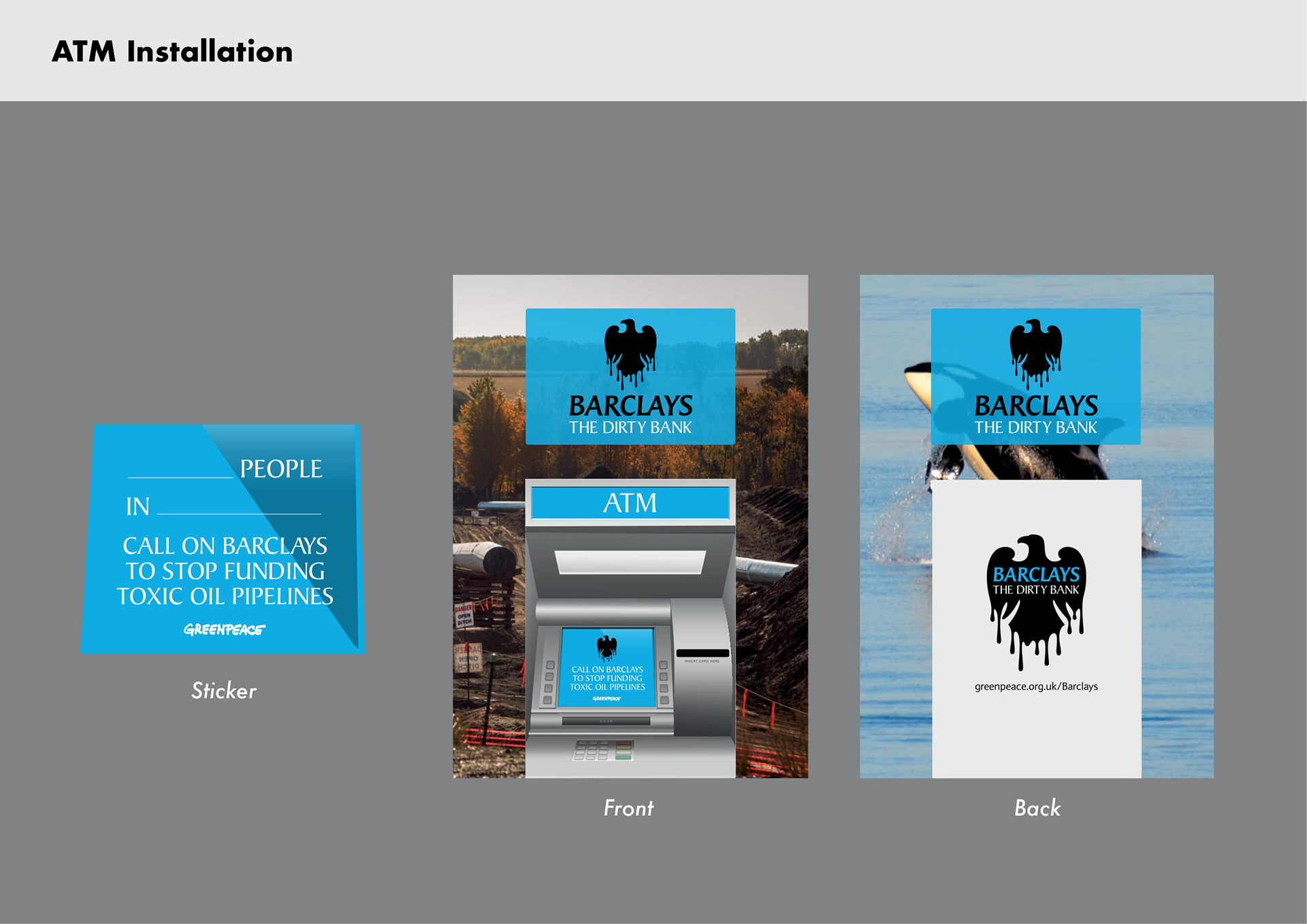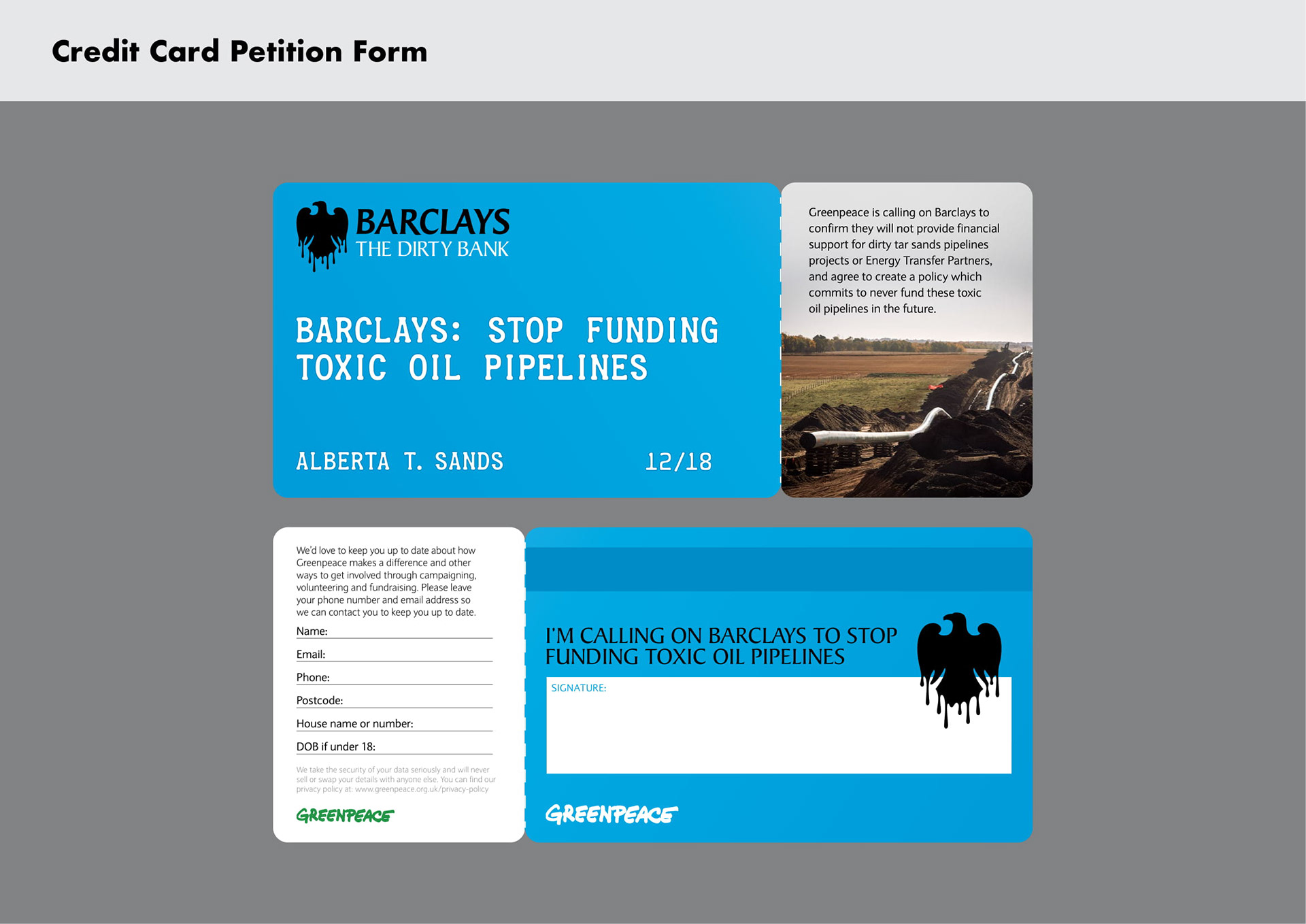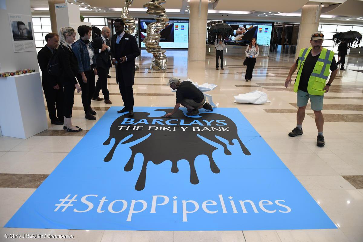 In 2018, we worked with agency Pentagram to develop an identity for a campaign calling on Barclays to stop funding toxic tar sands pipelines. The identity hijacked Barclays recognisable logo and aesthetics, revealing the real dirty nature of their business.