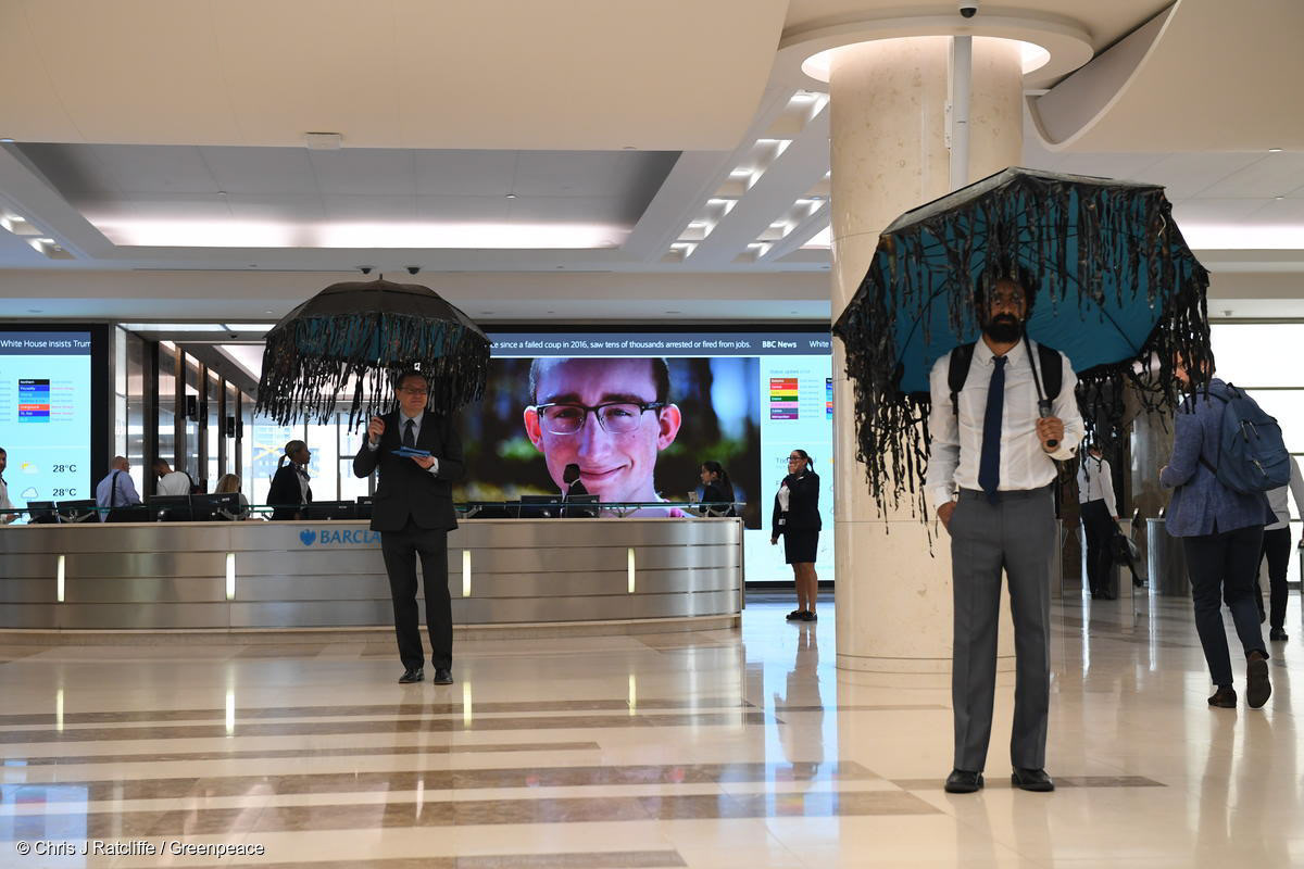 Employees queue up to enter the rebranded dirty Barclays HQ. Volunteers dressed as dirty oil bankers hand them leaflets.