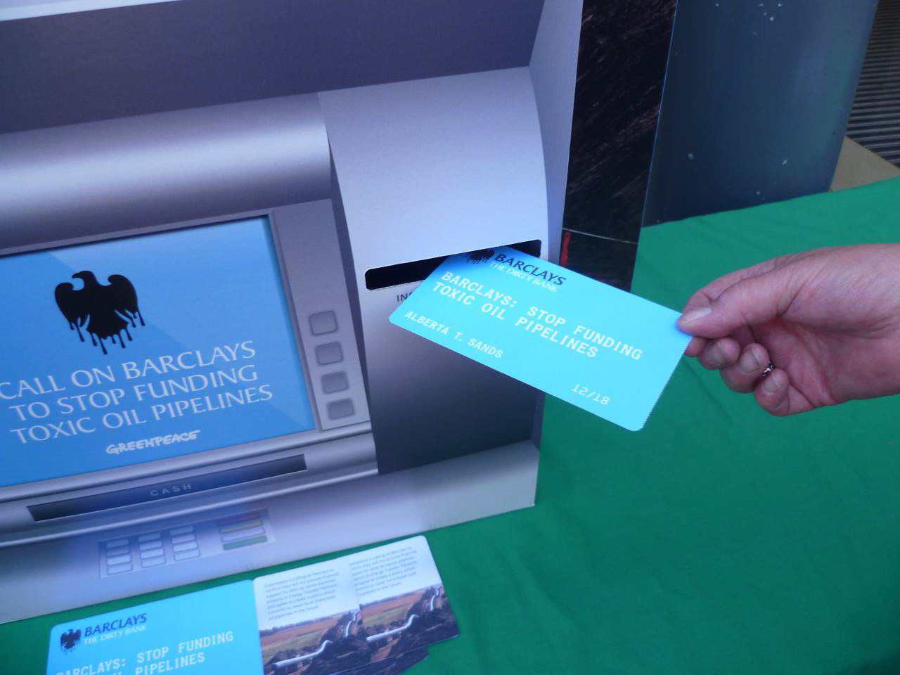 Inside, volunteers rebranded the lobby, and volunteers dressed as oily bankers handed out leaflets, whilst also playing messages on portable speakers from disappointed Barclays customers.