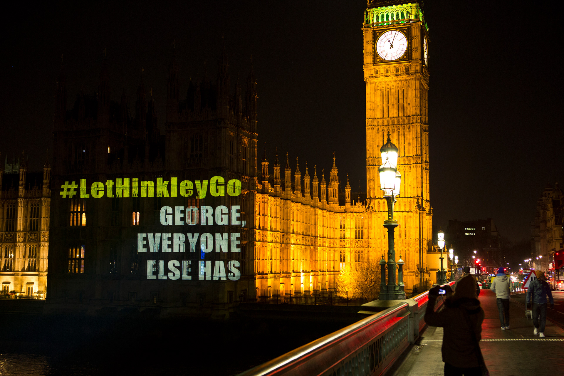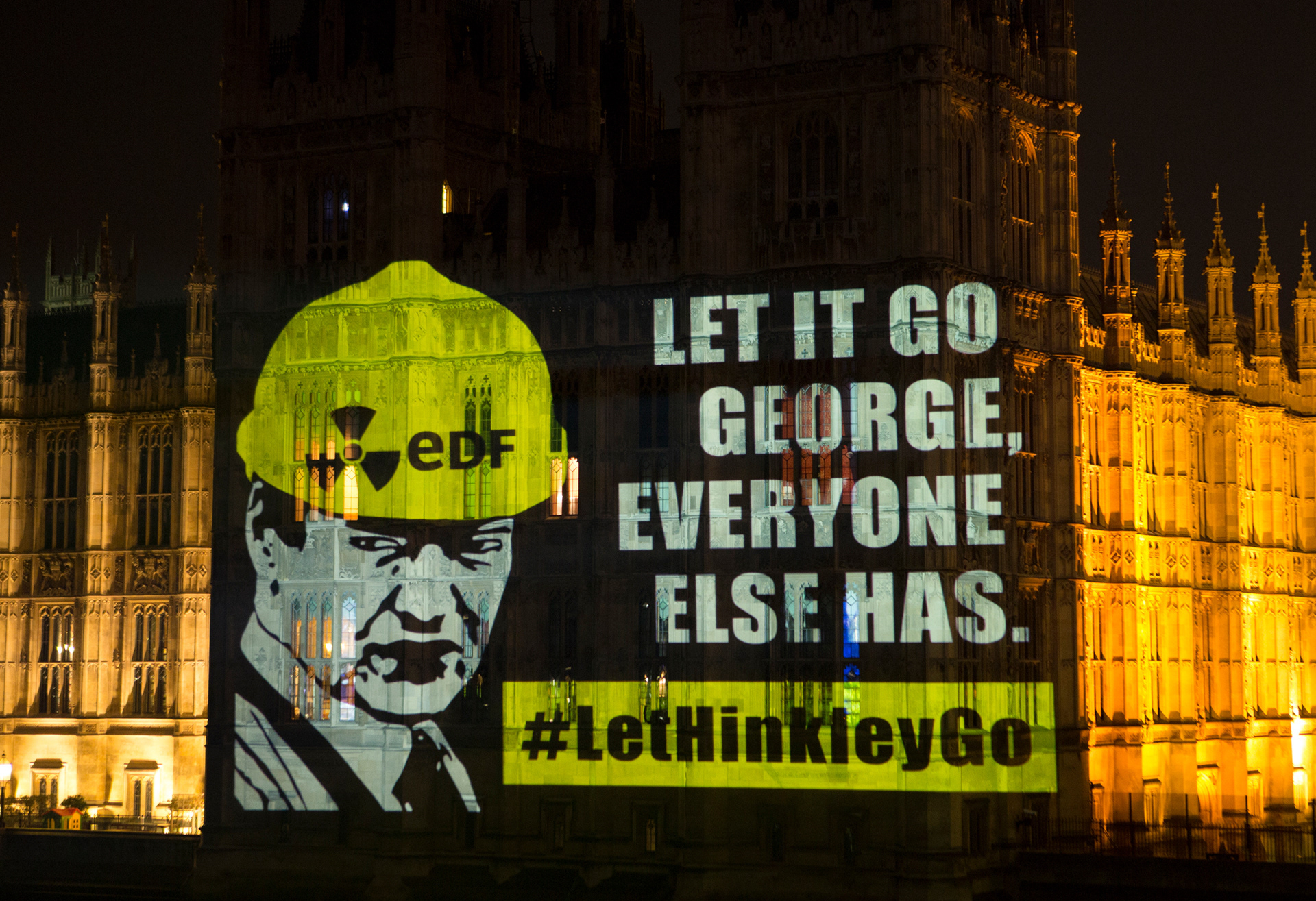 Designs for Greenpeace projection on the Houses of Parliament, calling on then Chancellor George Osborne to "#LetHingleyGo". The planned nuclear power station at Hinkley will be the most expensive in the world to build if it goes ahead.